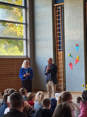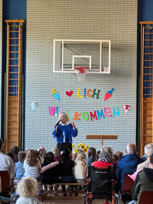 Nach der Segnungsfeier in der Kirche wurden die Schulanfänger mit ihren Eltern in der Turnhalle herzlich mit einem Lied von der Klasse 4b und von der Schulleiterin Vera Winkler-Theiß begrüßt.