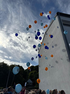 Gestärkt mit einer Einser-Breze ließen die Erstklässler zum Abschluss Ballons, gesponsert vom THW Laaber, in den Himmel steigen.