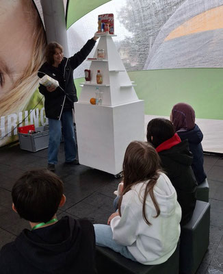 Anschließend gab es ein aktives Spiel zum Thema gesunde Ernährung, bei dem alle Kinder mitmachen konnten. Zum Schluss sortierten die Kinder echte Lebensmittel an zwei Tische: